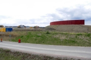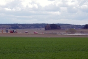 Bullerskydd i form av ett falurött plank vid Danmarks by. Vägen Danmark-Bergsbrunna i förgrunden. (Bild-ID: 55-0164) |