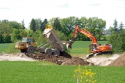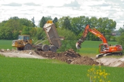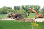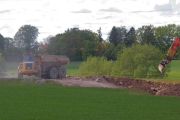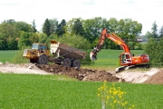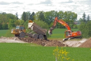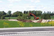 En grävmaskin lägger ut stora jord- och stenmassor på platsen där Lv290 tidigare passerade motorvägsbygget. (Bild-ID: 55-0195) |