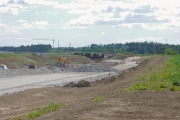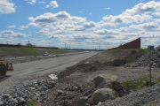 Gång- och cykelbanan österifrån. Avfartsrampen söderifrån kommer att gå över gång- och cykeltunneln, medan motorvägen passerar bakom jordallen med den gula containern och över broarna till höger. (Bild-ID: 55-0183) |