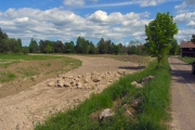 Gång- och cykelbanan mitt i bild och f.d. Lv290 till vänster, nu båda grusvägar. Vy söderut. (Bild-ID: 55-0200) |