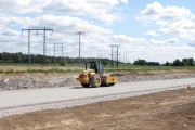 Ett arbetsfordon jämnar till utlagt grus på en av motorvögens blivande körbanor. (Bild-ID: 55-0223) |