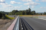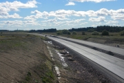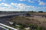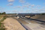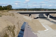 På den norra sidan av motorvägen har man ännu inte kommit lika långt med planeringen av dikesområdena, bortom järnvägsbroarna håller man på att sätta ut betongbrunnarna i diket. (Bild-ID: 55-0271) |