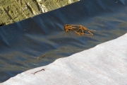 Underst i de schaktade lerslänterna läggs någon typ av plast- eller fibermattor som fästs med bockade järn, likt jättelika häftklamrar. (Bild-ID: 55-0269) |