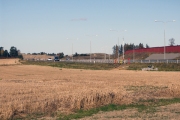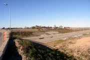 Vy norrut längs nuvarande motorväg från Danmark. Mitt i bild skymtar bron i trafikplats Säby på vilken trafik in mot Uppsala skall köra efter att ha svängt av längs bullerskyddet till höger i bild. Den nya motorvägen kommer sedan att svänga höger in under denna bro. (Bild-ID: 55-0283) |