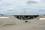 Den nordvästra bron i trafikplats Bärbyleden. Lägg märke till att det tillfälliga betongfundamentet på mitt mellan bropelarna är borttaget. (Bild-ID: e4-0167) |