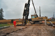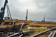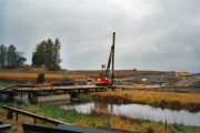 Full fart på arbetena på båda sidor om ån. På norra sidan kan den blivande motorvägen ses som ett grått streck över de gröna fälten. (Bild-ID: e4-0190) |