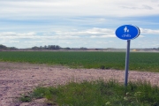 Gång- och cykelbana är det tydligen här, rakt ut på fältet... (Bild-ID: e4-0194) |