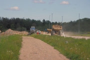En grävmaskin lägger ut stora jord- och stenmassor på platsen där Lv290 tidigare passerade motorvägsbygget. (Bild-ID: e4-0195) |