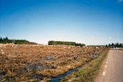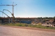 Gjutning av bron för södergående trafik i trafikplats Björklinge. Bropelarna för den andra bron är redan färdiggjutna. Bilden från den 9 maj 2003 visar ungefär den plats där broarna nu byggs. (Bild-ID: e4-0082)