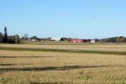 Vy norrut från vägskälet mot Danmark vid Almungevägen (LV282). Bygget har ännu inte startat men vägen kommer senare att byggas i bortre vänstra delen av det stora fältet (hitom de röda byggnaderna och bakom busskurens tak) (Bild-ID: e4-0000) |