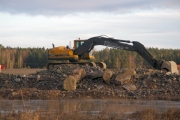 Många maskiner används under bygget. Denna står på de massor som skapar överlast i vägområdet för att leran under skall sätta sig snabbare. (Bild-ID: e4-0100) |